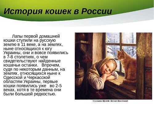 Very soon these animals became very popular. Breeding them has become a common occupation. Many churches kept cats in their possession of grain stocks.For an attempt to steal a home favorite, there was a large fine of money. In the 18th century, cats in Russia spread everywhere. The domestic cat becomes a favorite for its owners. At this time there were signs and beliefs associated with these animals.