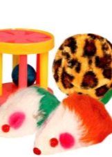 - Toys. On the shelves, you can see toys such as whelping mice, balls, feather sticks, gummy scattering balls, balls that ring inside the bells and others. Sometimes even a treat can be a toy. The main thing is that the toys are safe - the mice should be well-made, and the balls should be closed. It is impossible for a kitten to play with threads of yarn - it threatens to die, because a baby can eat threads and clog its bowels. The same goes for the New Year's rain.