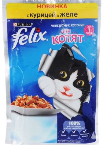 - For kittens 1-5 months provided wet food. The bag always contains information that this type of food is intended for kittens, in addition, they can be classified depending on the breeds of cats. Some owners prefer to buy food that is suitable for the breed of his pet. Here, too, should be guided by the price. Food is more expensive is higher quality, there are more natural supplements that are useful for a growing body. Wet food for kittens are composed of soft little pieces in a jelly or broth, in the form of a soft paste, which a small pet can easily cope with.