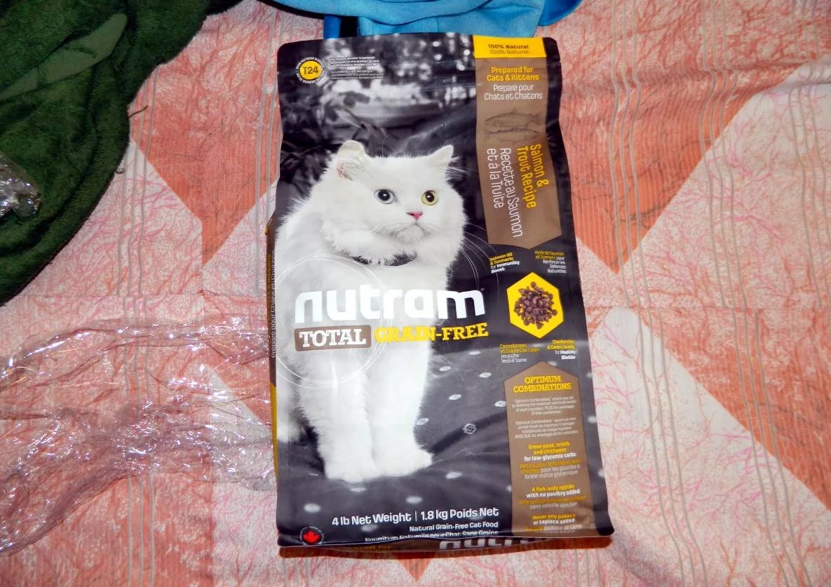 - Nutram Total Grain Free - Canadian grainless product that has two kinds of tastes - chicken and fish. Suitable for cats of different breeds of any age. Animal protein in the formula contains up to 35-36%, and legumes are a source of carbohydrates. For the production of the product only fresh meat is used, this formula is rich in vitamins and minerals, does not contain GMOs and soy.