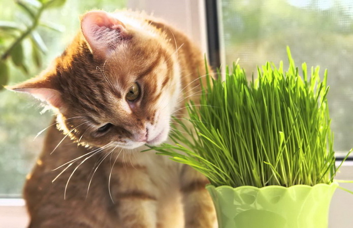 Special grass can be purchased in the form of seeds and grown in a pot on the windowsill.