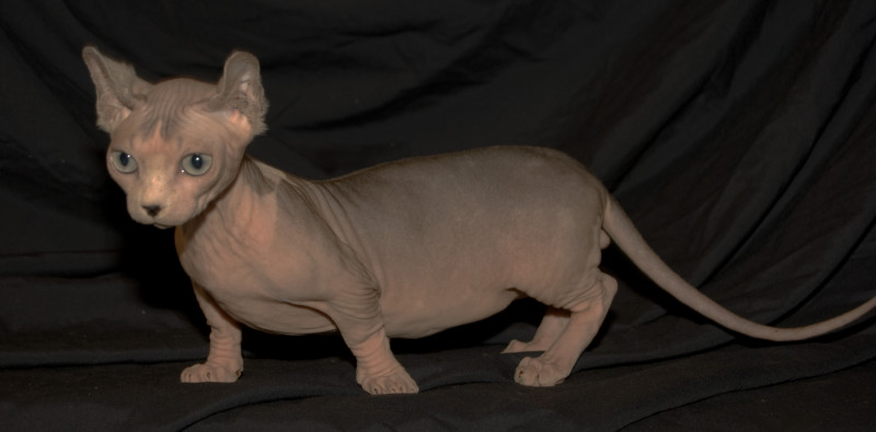 Later, Burmese cats and Devon Rexes assisted in breeding the breed. The result was a bit like bambino cats, The kitten was born with short legs and unusually silky skin.