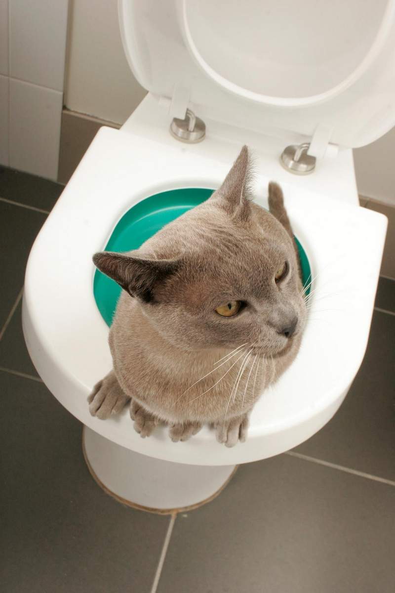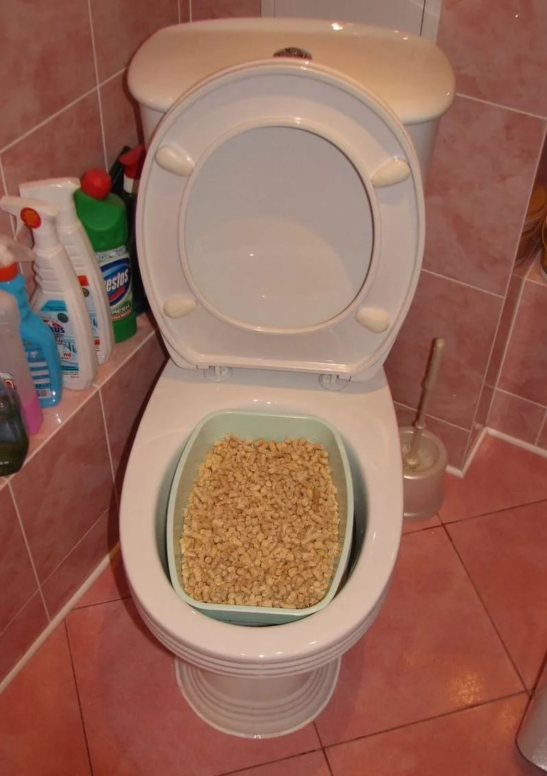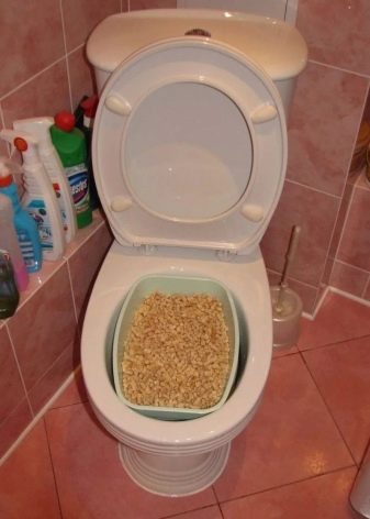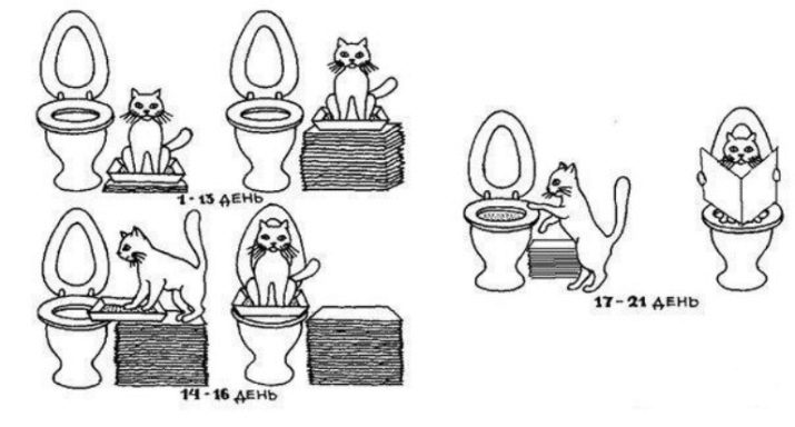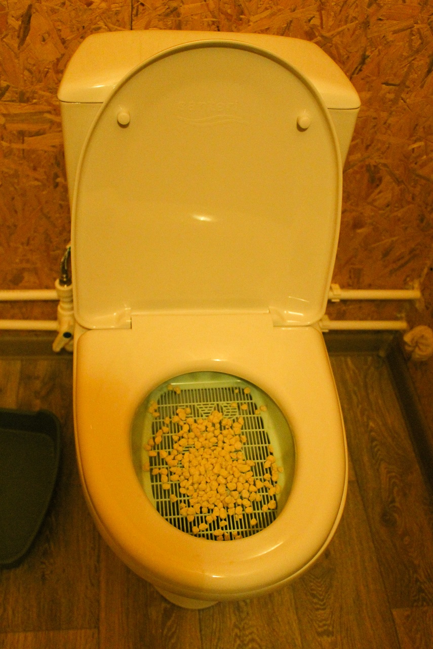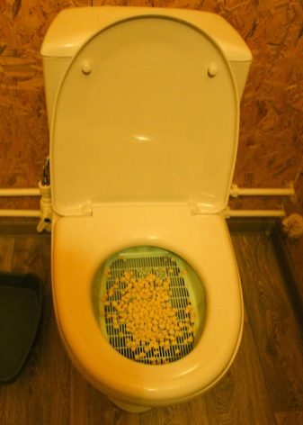 It will take the pet several days to get used to the improvised tray on the toilet. When the animal will go to the toilet without any problems, it is necessary to make a hole of small diameter in it or remove the top plate.