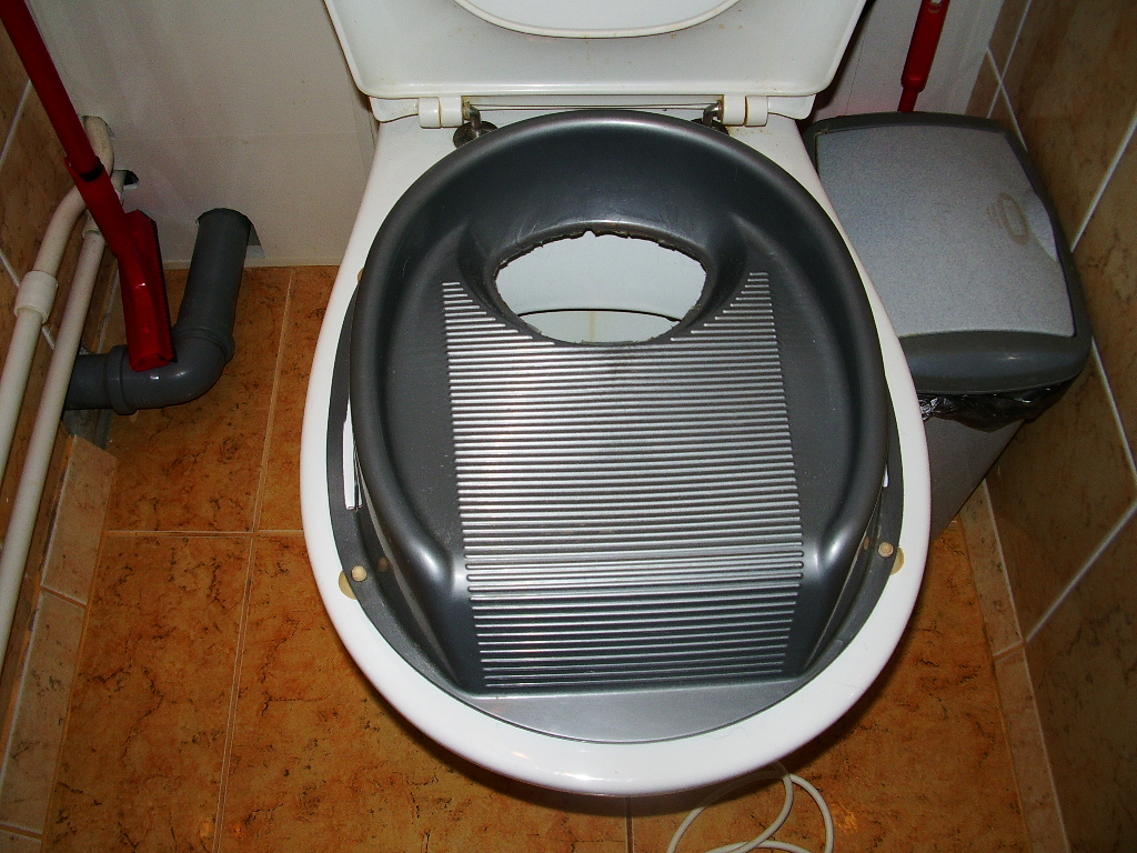 Most often they are made of old trays, cutting them to the size of the hole in the toilet and attaching fasteners.