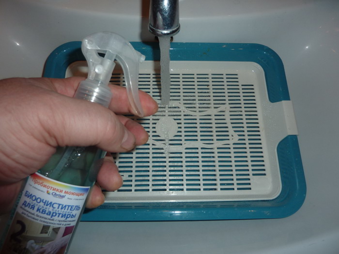 Washing the toilet after every trip of your beloved pet to the toilet is not always a good idea, because not everyone is at home and can do it all the time. Then it is advisable to use the odor absorber for the toilet (freshener). Spray just sprayed into the filler.