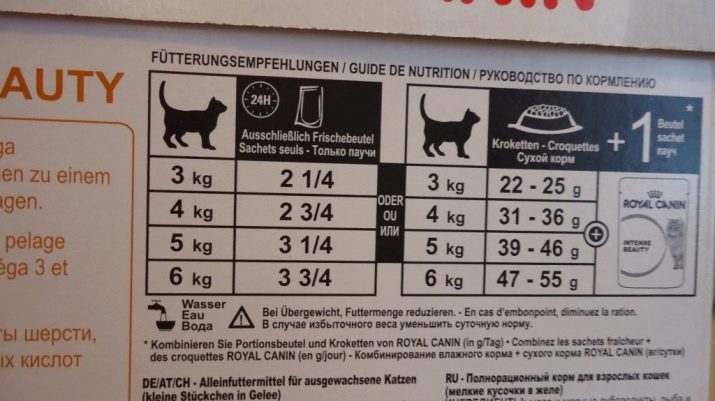 Ready cat food from different manufacturers differ in nutritional value. In order not to be mistaken with the dosage, manufacturers place on the packaging a table of age and weight, as well as the recommended volume for a particular animal.