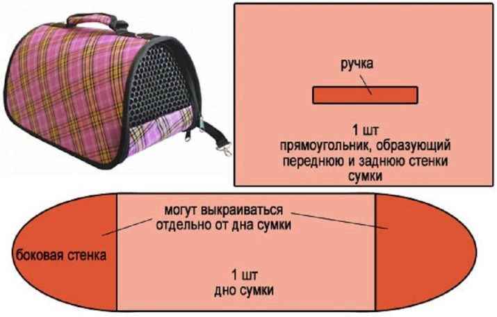- Build a pattern. The simplest form is a triangle or a quadrilateral. One of the sides must be detachable, with a wired "zipper", the second - with a grid for air flow (suitable durable mosquito with metallization). The base has the largest area, for it the cover is sewn, to which other parts are attached. The dimensions of the elements should allow the animal to freely be positioned internally horizontally and vertically.