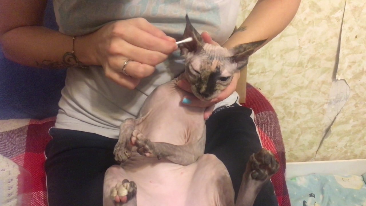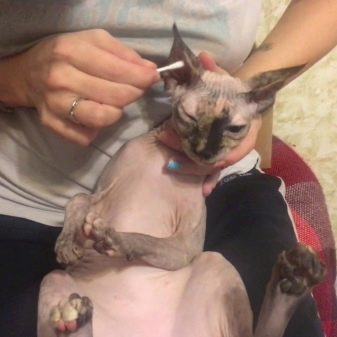 - Poor hygiene. Since the St. Petersburg sphinxes are hairless animals, they require special care. On their skin is the formation of fatty layer, and this is a comfortable environment for the development and reproduction of dangerous bacteria. Therefore, the cat must be bathed daily, using special protective equipment. Also in the ears of this breed is often accumulated sulfur, which must be removed with a cotton swab once a week.
