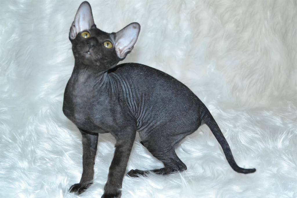 - Flock cat. The skin is soft and velvety. Mustaches are absent, wool on kittens is about 2 millimeters.