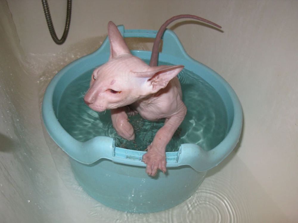 Peterbald needs more bathing than the average cat. The fact is that his body is prone to sweating and other pollution. But veterinarians do not recommend washing the St. Petersburg sphinx every day.