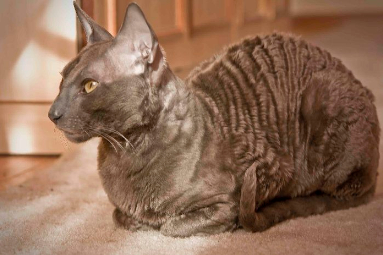 But this decorative effect does not prevent the cat from being strong and active. The animal makes every effort to become an equal member of the family. Cornish Rex were bred in the UK (more precisely, in Cornwall) by 1950. Initially, the purpose of their use was to protect the grain in barns from rodents.