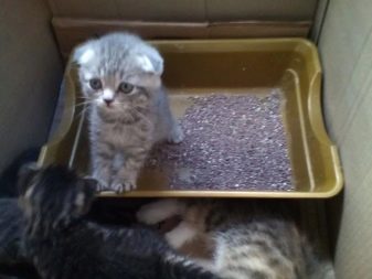 Usually, little Scots get used to the toilet from a young age, while still in the nursery. After acquiring an animal and settling it in a new place, it needs a certain time to adapt. Therefore, owners of fluff should pay special attention to the toilet, choosing a filler of the same brand as it was before. Scottish kittens love when the toilet is filled with silica gel, as it makes rustling sounds. In addition, this filler perfectly keeps unpleasant smells.