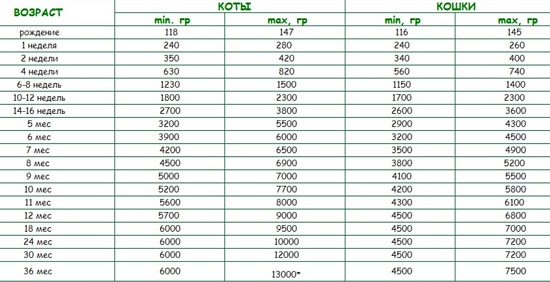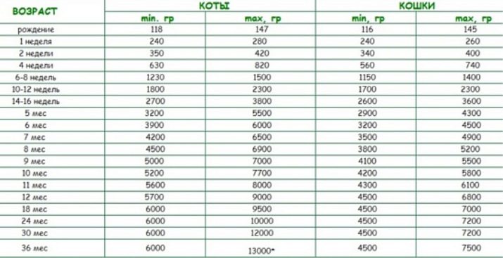 The height of the girl at the withers is usually from 28 to 30 cm, the male - from 29 to 33 cm. Sexual maturation of the breed occurs at 7-8 months. The average weight of animals during this period is from 3.5 to 4 kg for a cat and from 4 to 5 kg for a cat.