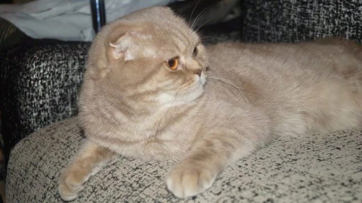 Deer-colored cats have a beige color of fur, and the legs and pads of the paws are pinkish. You should not confuse deer coloring with lilac color, which is closer to the lilac shade. These are different colors. Scottish cats with tabby violet are also found. The cat's main coat color is beige, and the pattern is painted in dark lavender tones.