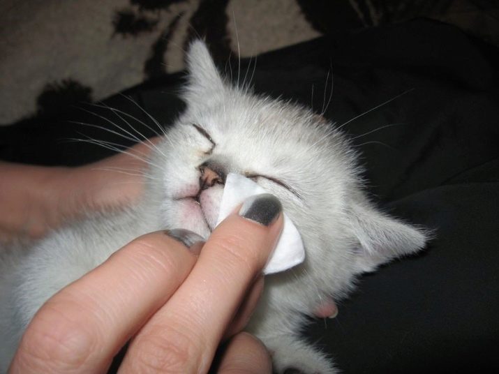 Almost from birth, kittens have their eyes cleaned in order to get them accustomed to hygiene. The procedure is carried out every 5-7 days. To do this, pick up a cotton pad, moisten it in water and gently treat it to the corners of the eyes, the upper and lower parts of the eyeball.