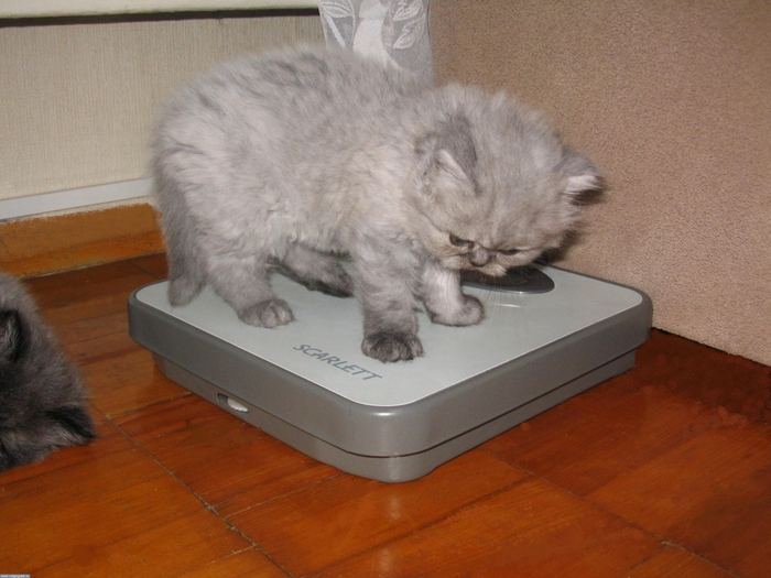 The rate of weight gain is non-linear - by the end of the first year of life, growth slows down until it stops (an adult male or a “Scot” female). From the 5th month the weight gain starts to slow down, and the kitten reaches 3.2 kg. When tracking the dynamics of weight gain, approximately 20% of the situation is predetermined by the genetic data of both parents. Half-month kitten weighs an average of about 2 kg.