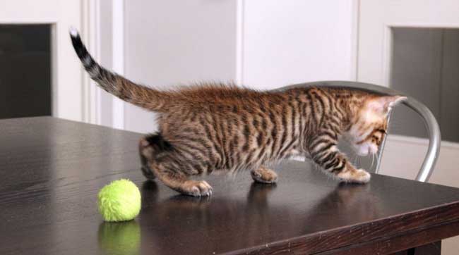The playfulness and sociability of striped cats allows them to become universal favorites. This sweet and mischievous creature is quite curious, so it will explore all the corners of the rooms. Such a baby should get as many toys as possible, otherwise equipment can suffer from its persistence. Noticed that This pet prefers to set up caches in the apartment, so if any thing disappears from the owners, then the Fuzzy is most likely to blame.