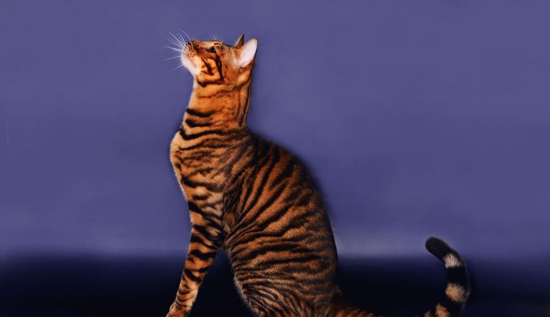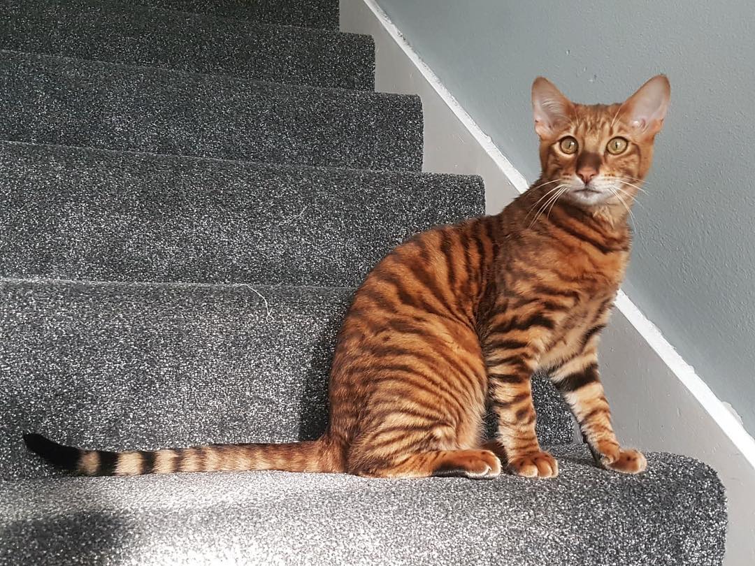 The nose of a purebred pet is characterized by length, muscularity, roundness, it is expanded to the end. Toyger limbs are strong, have medium length and long fingers. The tail has a long length, it is characterized by muscularity and roundness of the end, it is usually omitted.