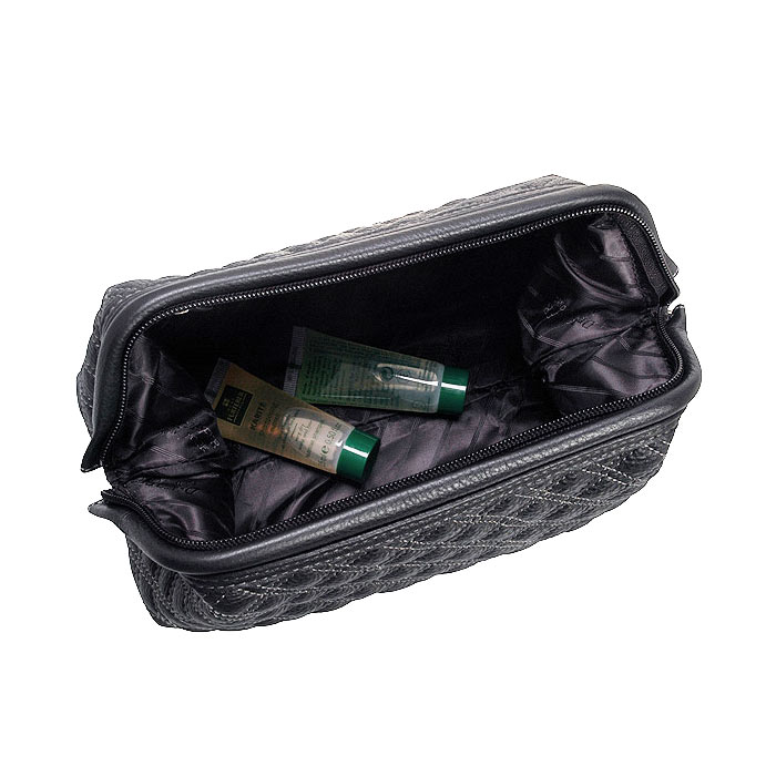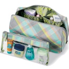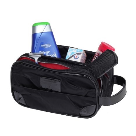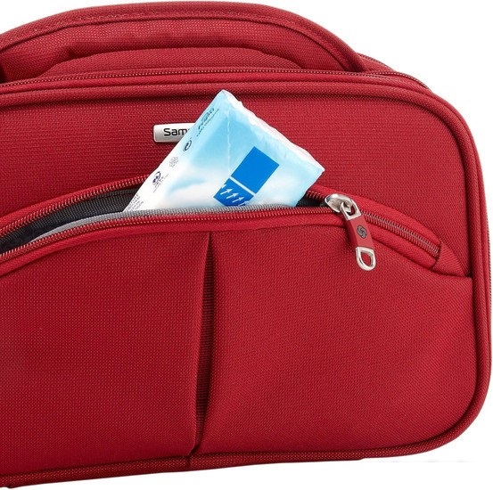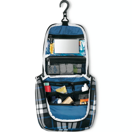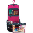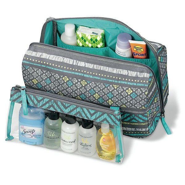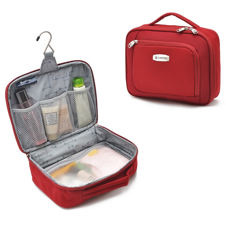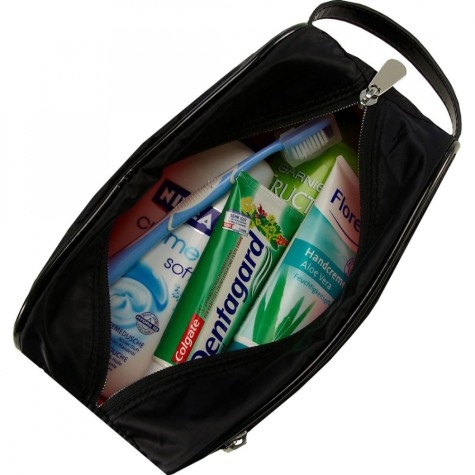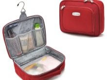 Samsonite Thallo Cosmetic Bag is a cosmetic bag in which you can put all the shower products in full size, but the only negative is that you can only place them lying down. It will also fit contact lenses, wet wipes and more.