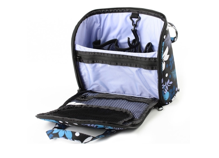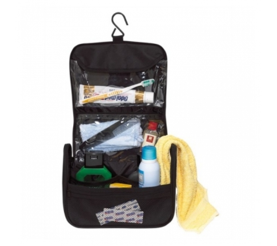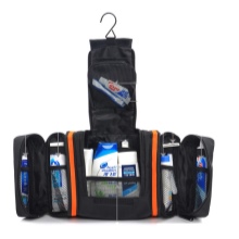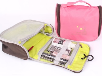 The folding road cosmetic bag easily turns into a locker. It's simple - she has a hook. After all the transformations have occurred, use this hook to attach the cosmetic bag to the wall. She has deep pockets where you can easily put different sprays and shampoos. In the folding bag there should be opaque pockets for personal hygiene items.
