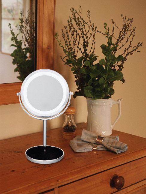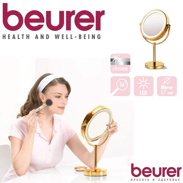 - Products of the German company Beurer practical and elegant. All models have a robust swivel mechanism and two glasses: one is ordinary, the other with a magnification of 10 times. Mirrors of this company serve for many years: high quality is achieved due to the chrome-plated coating, which is difficult to damage. The range has options for desktop and wall designs, they are equipped with LED lighting around the perimeter.