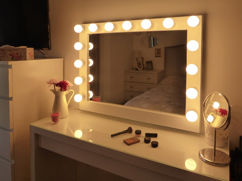Most types of mirrors can have exterior or recessed lighting. The first type of lighting depends on the electrical network and is usually installed in stationary mirrors. This light is located around the perimeter of the canvas and gives a powerful luminous flux. These panels are often already included with the cabinet. They can be seen, for example, in professional make-up rooms.