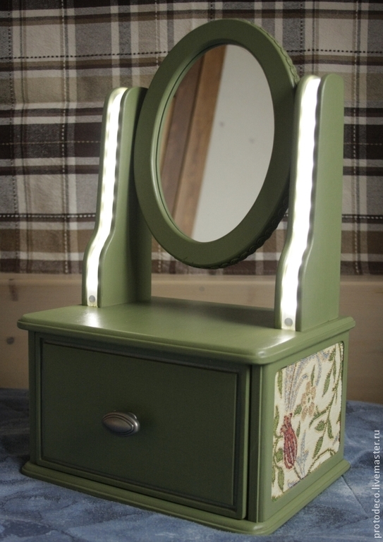 On the dressing table or nightstand in the hallway can fit a panel just over half a meter high. It may be rectangular or oval. For a round mirror, a diameter of 40 cm will be appropriate.