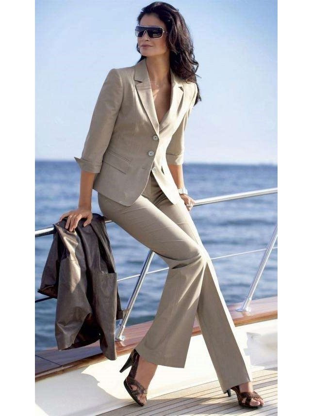Owners of the "apple" type can try on jackets with a rather deep V-neck. The length of the jacket can be up to the hip line or slightly below. It is advisable to choose a dark color scheme, which significantly draws and slims the figure. And beautifully placed bright accents (neckerchief, beautiful brooch, elegant clutch, etc.) will help you to beat the restrained colors beautifully. Pants should sit tight enough in the hips and abdomen. The model can be straight or slightly flared.