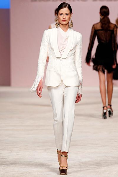 The snow-white suit always looks very elegant and fresh. Especially when white is presented in such an elegant and feminine costume design. Concise jewelery and a black bag complete the look.