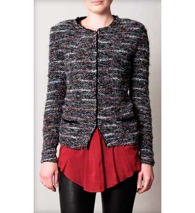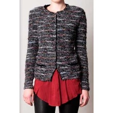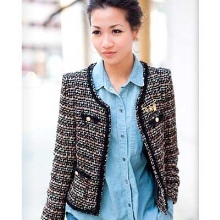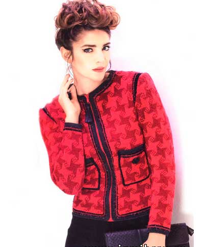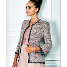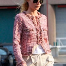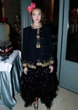 The classic jacket from Chanel is made of soft tweed. The length is short - it barely reaches the top line of the belt of the skirt. The drawing is always very elegant - in an intricate cage or with a melange effect. The silhouette of such a jacket is necessarily semi-adjacent, there is no collar, the fastener is on buttons or missing. Koko herself was very fond of the last version: a delightful fashion-maker pinned such a jacket with a brooch or cameo.