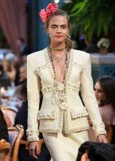 The legendary jacket from Chanel always had such characteristic features as patch pockets - two or four. They were decorated with original braid, the color of which either coincided with the tone of the costume, or contrasted with it. In the course of the evolution of the suit from Chanel, models of jackets began to appear, fitted with a collar - fur or English (short, velvet).
