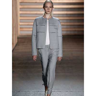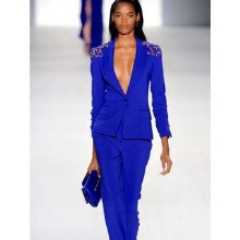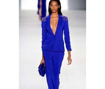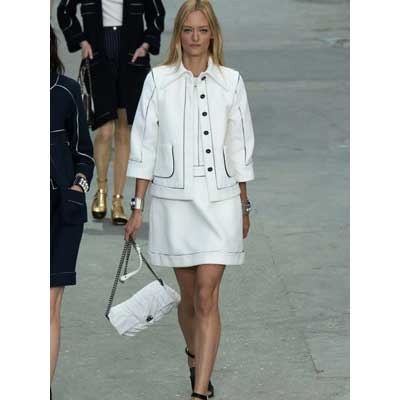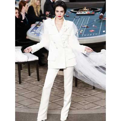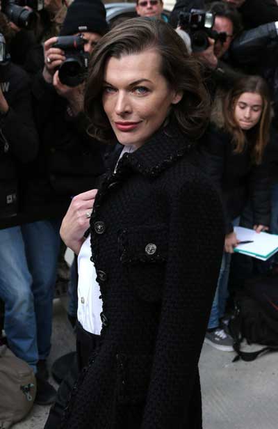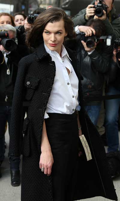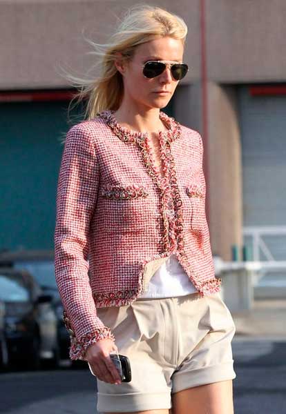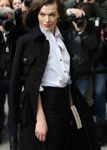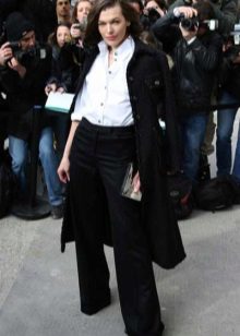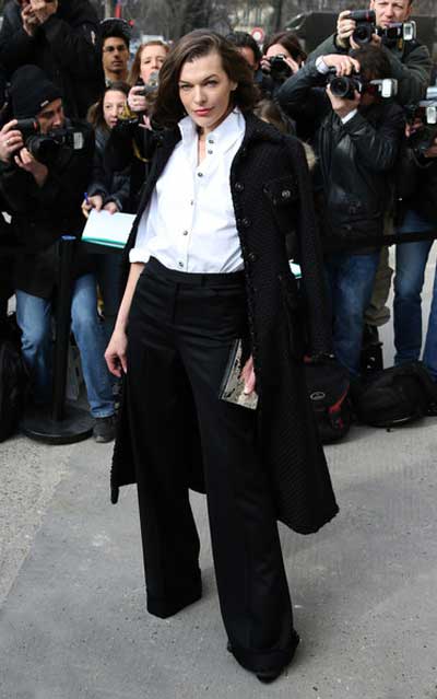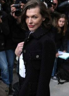 Even more courageous version of Chanel's ladies' dress is demonstrated by the heroine of the exciting blockbusters - Mila Jovovich. Such a pantsuit is especially suitable for a woman of mature age, will emphasize the solidity of her status and, perhaps, the imperious nature of character.