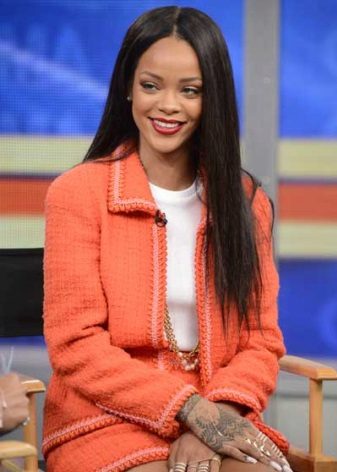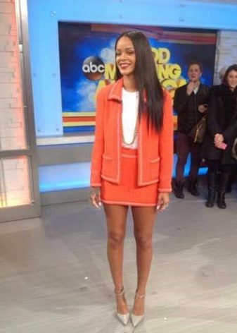 Popular singer Rihanna is also not averse to emphasizing her femininity with the help of a delightful style dictated by Chanel's costumes. Especially spectacular star of world radio looks in the ensemble of warm coral color, perfectly combined with the tone of her skin and type of appearance.