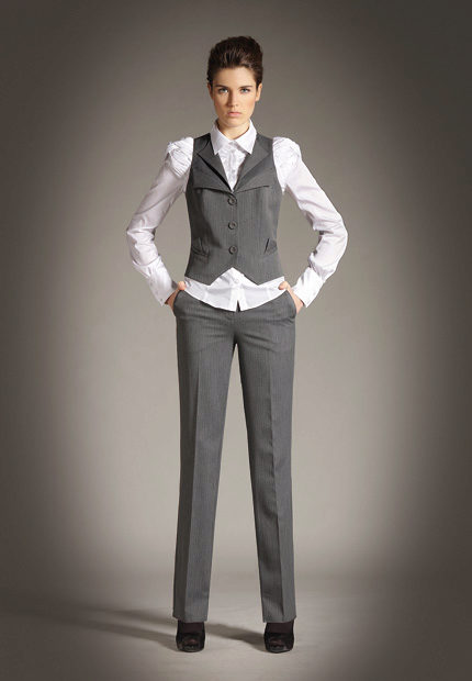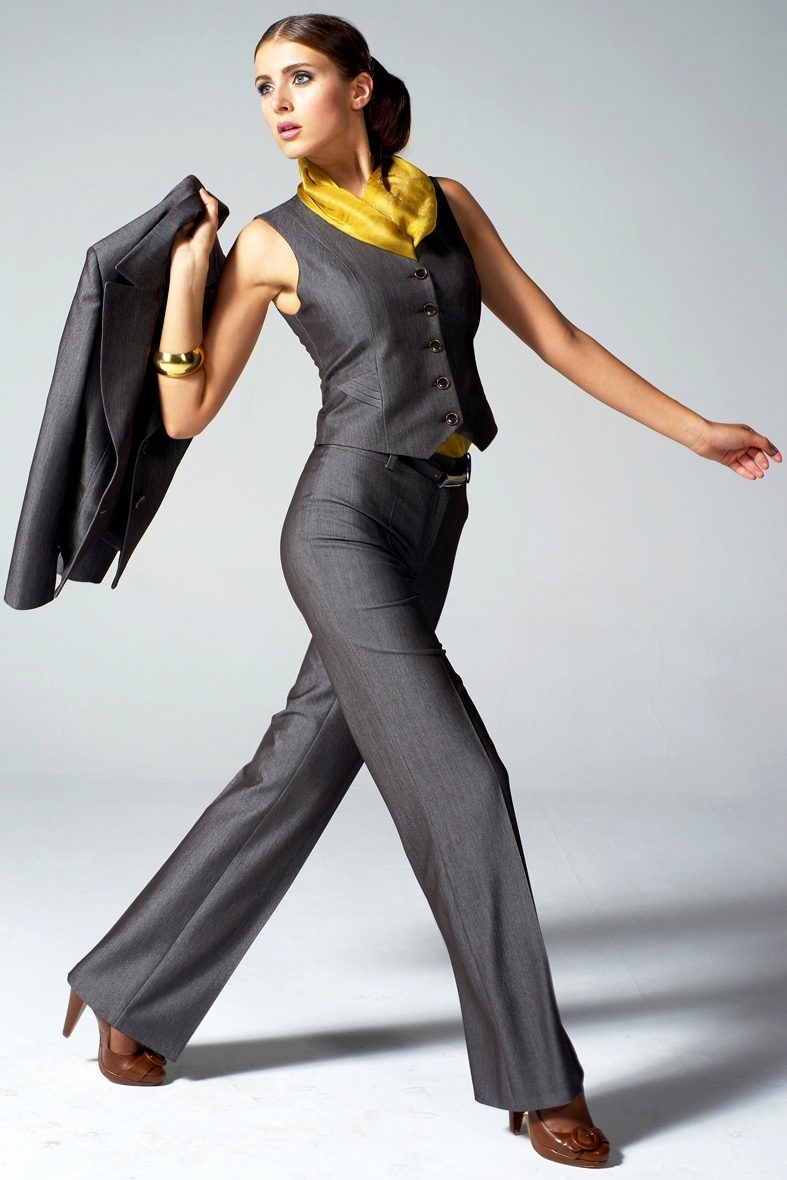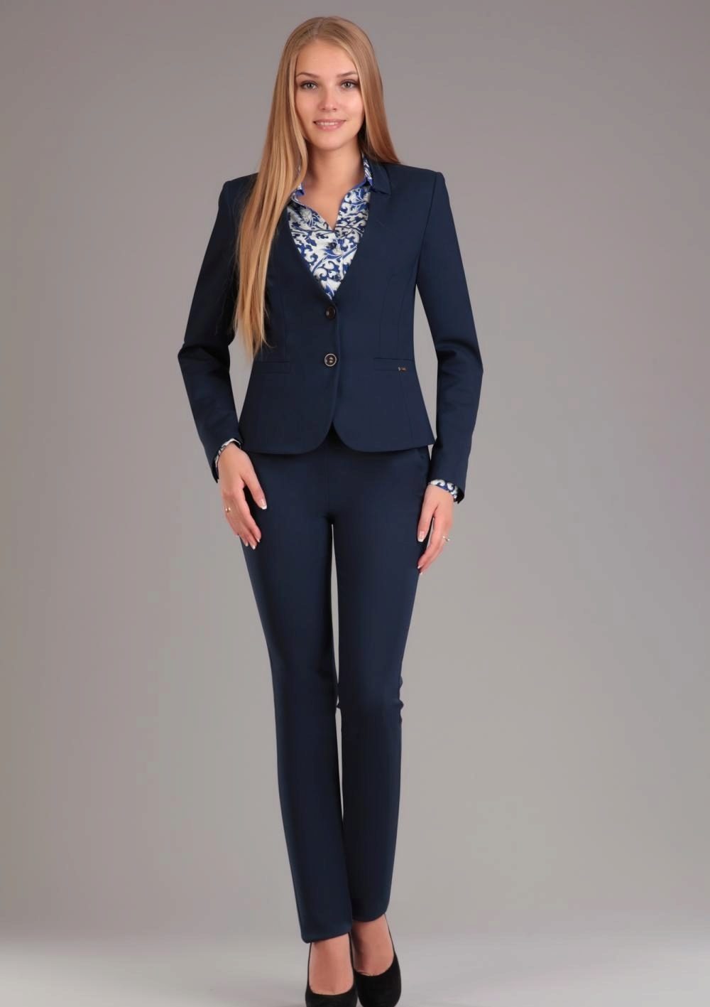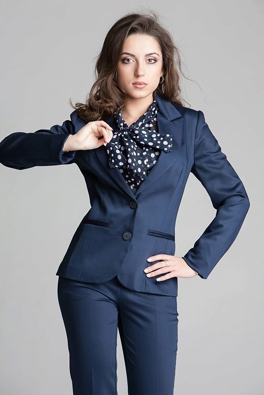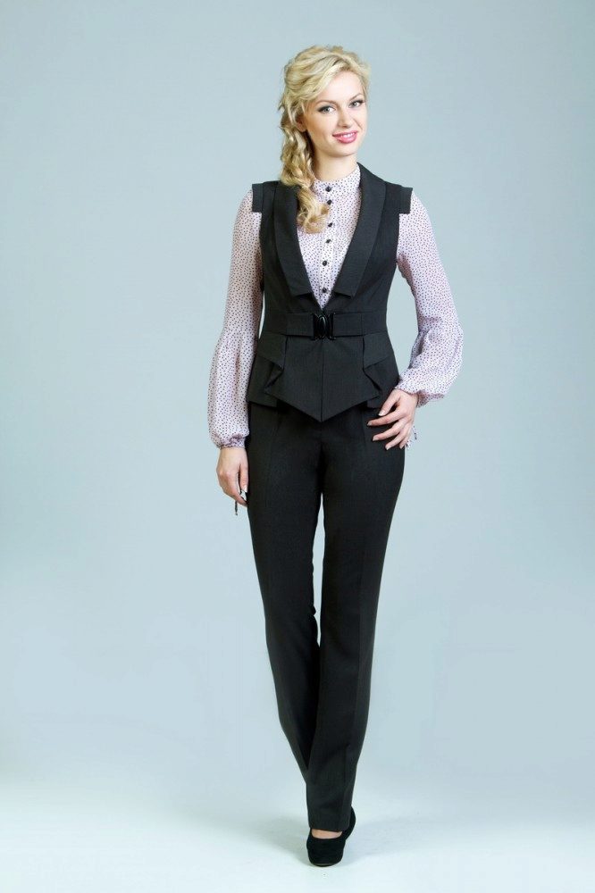 Business women's suits are of two types: "two" - pants or a skirt and a jacket and "three" - pants or a skirt, a jacket and a vest. A tie or bow tie is also an essential attribute of a business suit. The first accessory is suitable for an important business meeting, the second - for the evening. In everyday office life, a suit may well be worn without a tie.