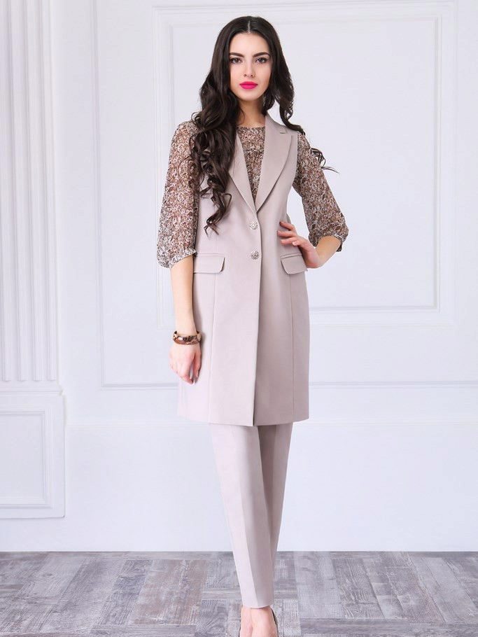 Three-piece suit has several versions. The classic version is considered a vest, and as the bottom can act as a skirt and pants. Another option is a set of skirts or pants, vest or jacket, as well as shirts or blouses. The third variant of the three-piece suit is a jacket, trousers and a dress. It is easy to guess that the dress can be worn separately or with a jacket, and by completing the trousers and jacket with a turtleneck, shirt or top, you can get a completely new look. Sometimes such sets instead of a jacket are supplemented with a vest in a contrasting color that can be worn directly over the dress.