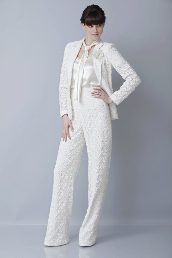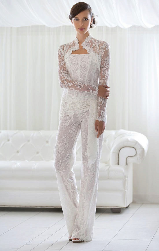 A three-piece wedding dress is a very elegant and luxurious option for original ladies. Such costumes are most often sewn from satin, velvet or silk, decorated with lace, rhinestones and sequins, golden or silver buttons. Of course, such costumes have the traditional light colors for the bride - snow white, champagne color or powdery shade.