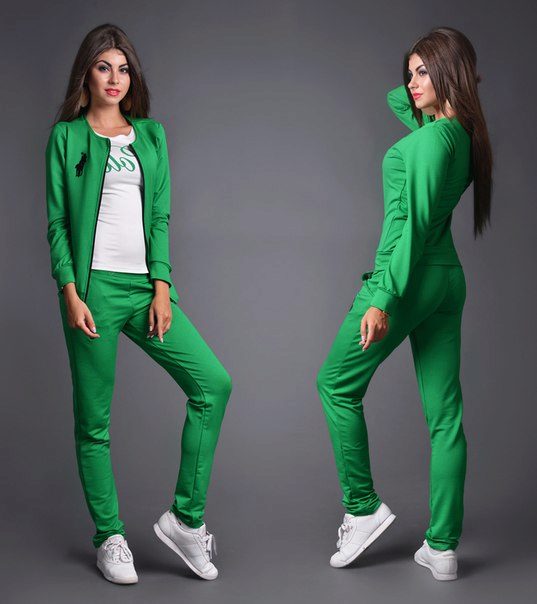 Three-piece fitness suit has several variations.so that you can easily pick up clothes for the right weather and for a particular sport. It can be a combination of pants + t-shirt + jacket with a hood, or top + shorts + jacket, or leggings and a vest + vest. Many brands offer such costumes, made in the same style.