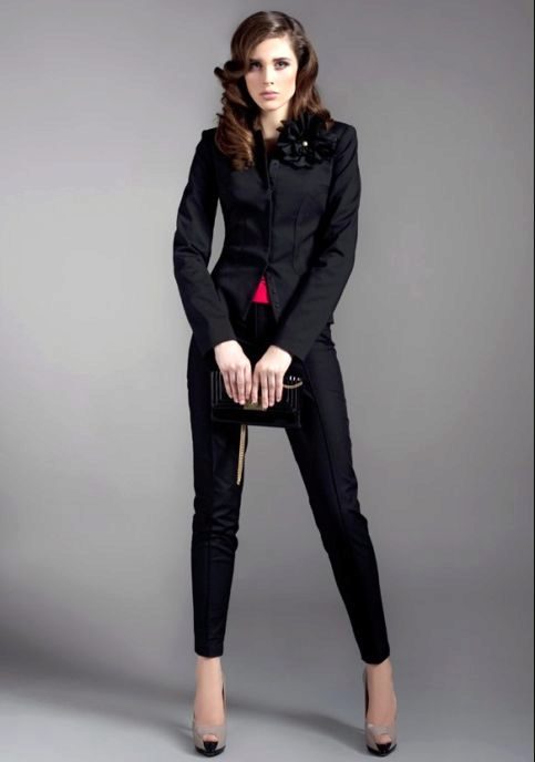 Timeless classics and color that is always appropriate is black. This is a great option for suit-three for the office and for an important meeting, and for the gala evening. Depending on the accessories, black can be both luxurious and restrained, inconspicuous, both camouflage and catchy. This is the most popular and most practical color, in addition, designers complement black with all sorts of prints: small stripe or “goose foot”, diamonds and a cage, embroider it with flowers or decorate with inserts of a different color.