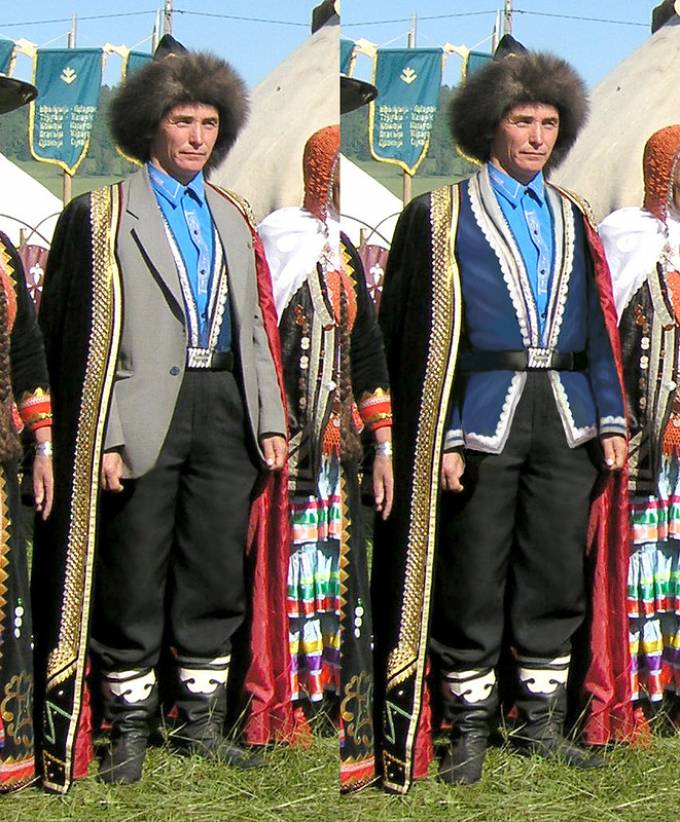 Bashkir men were not so fastidious in their apparel, so the men's national costume is a little less diverse, but no less magnificent. Looking at the Bashkir, you would see a loose shirt, pants and a robe that was replaced by a camisole. This is an everyday version of the traditional dress.