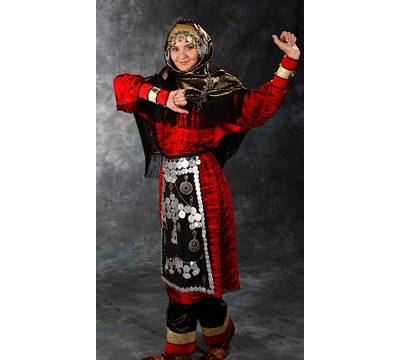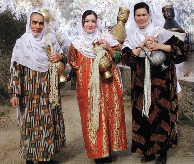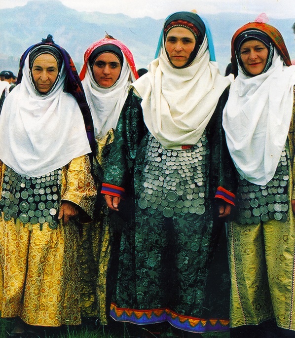 Women who lived in the mountains preferred wide long dresses and pants with an elegant gold pattern on the sides. As shoes they wore dudes or boots, and the headgear in each locality was somewhat different. The hair was neatly removed under a cap-chukhtu, over which a blanket was worn, and then a patterned shawl.