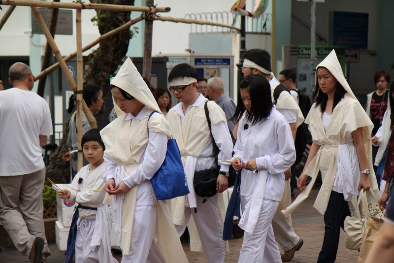 Chinese mourning costume must be made in white. Fabric purchased rough, but natural, with a yellowish tinge. The general ensemble consists of a long robe, a wide belt-sash and headbands.
