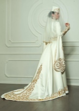The dress has the same cut, as usual, and consists of the same elements. A special feature is the color gamut. – Women's wedding dress is made of snow-white dense material, decorated with golden embroidery.