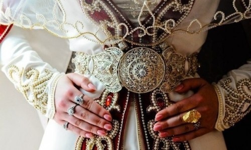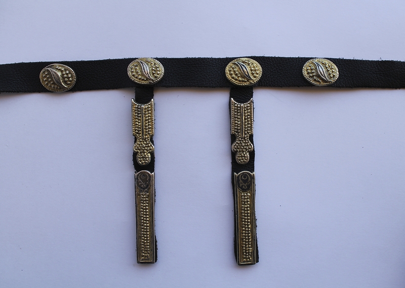 The belt of the women's wedding Ossetian costume is made of metal with gold leaf, decorated with various ornaments and embossments, and in some cases with small ruby stones.