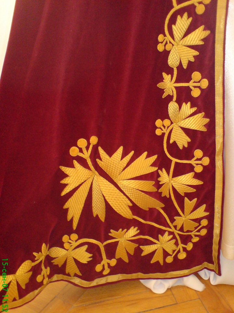 For models of top gowns with narrow sleeves, additional elements were used in the form of hinged sleeves made of the same velvet material, embroidered with golden patterns and ornaments.