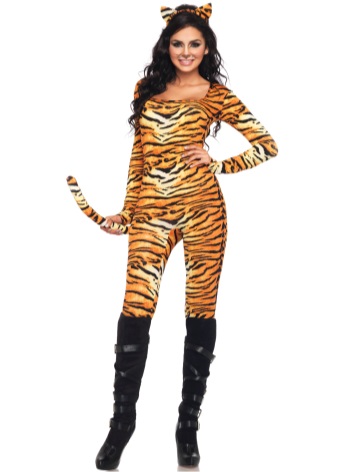 However, another version of this image may consist of a more elegant combination of a jacket for an animal tiger print with a rim of the same material. Other clothes can be of a neutral color or consist only of a body or a swimsuit of the same print and stiletto shoes. The main eerie element of this image can be fangs and decorative drops of blood, making it clear that this tigress is not at all "manual."