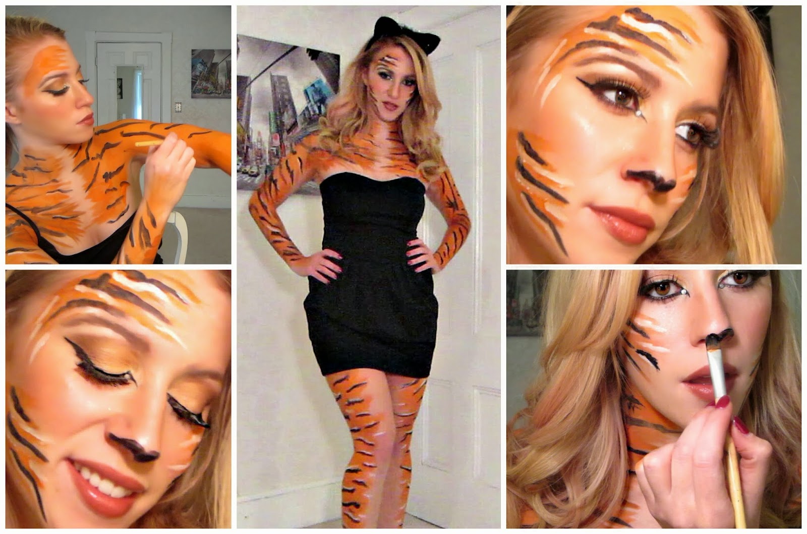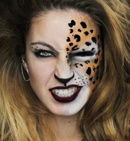 In this case, you need a person who either just knows how to draw beautifully, or this is his profession. The make-up of a tiger on the face is not so difficult, but it is much more sexual to try to make up only on bare hands and touch a little cheekbones and cheeks of a girl. Add this image can be a dense black corset and velvet tight leggings.