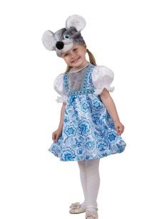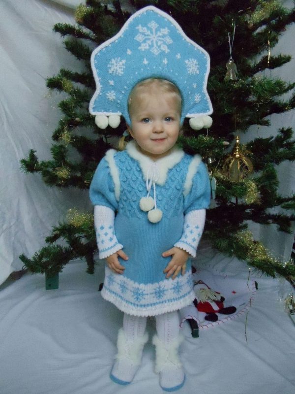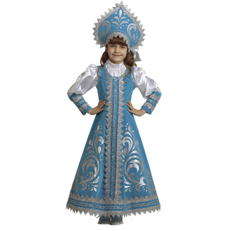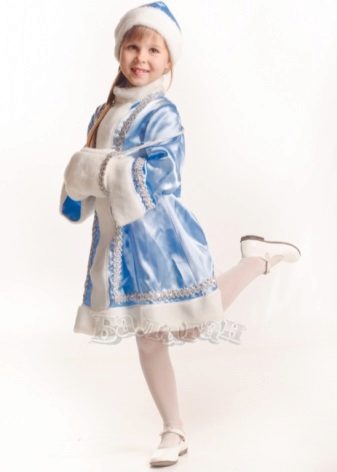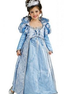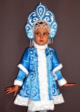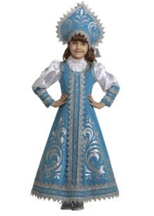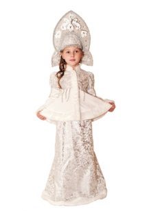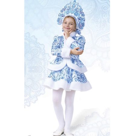 - Wonderful image of the Snow Maiden, perhaps the most popular option for the new year. The costume, consisting of a skirt and a jacket, is decorated with a blue pattern on a white background, and the painted headdress will be an excellent headdress.