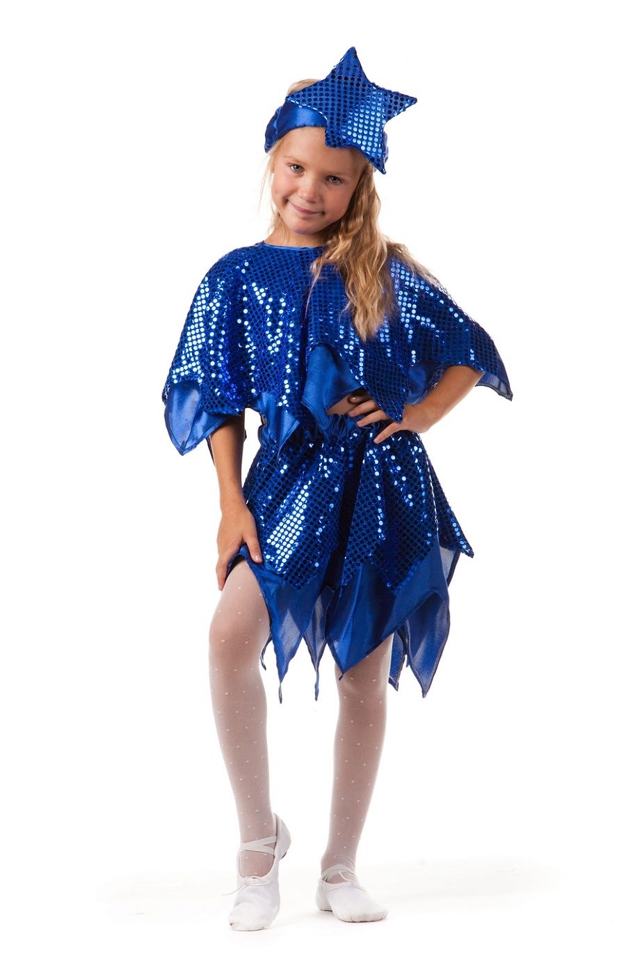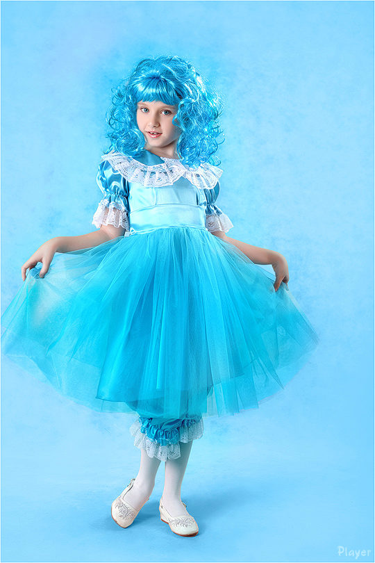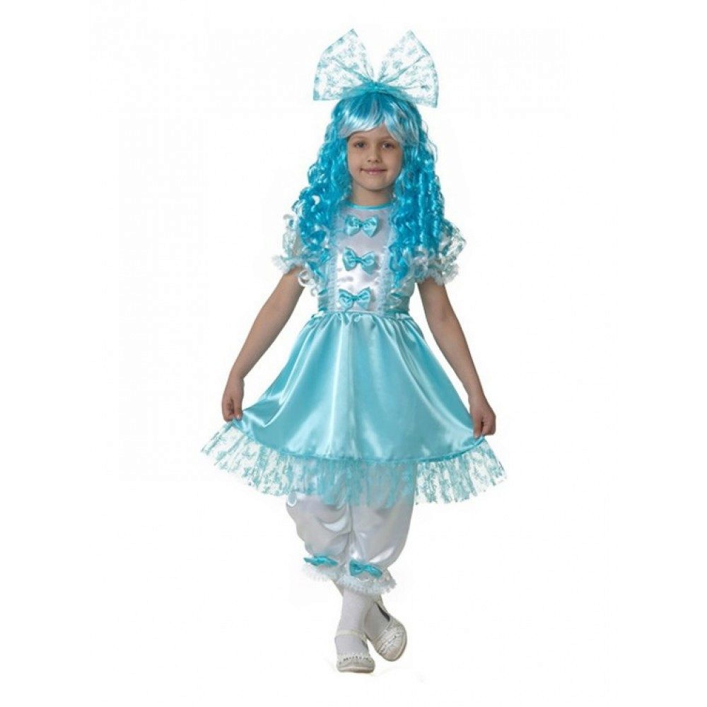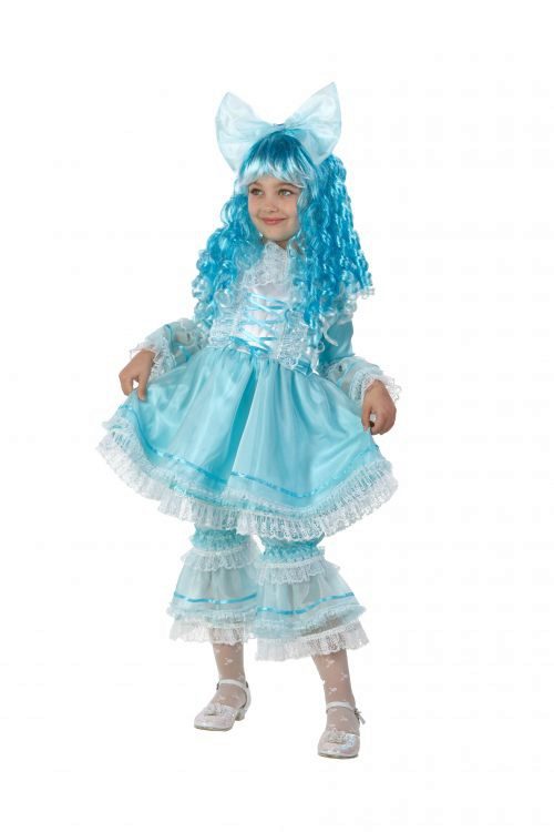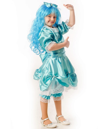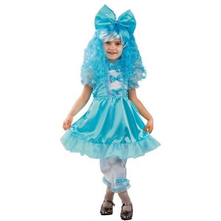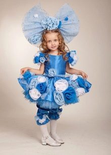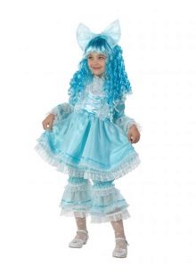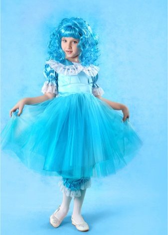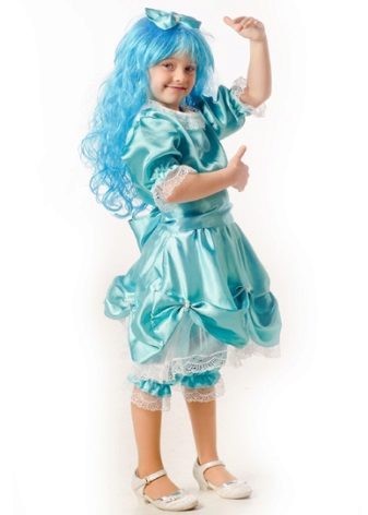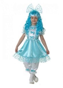 - Little Malvina will surely attract everyone's attention at the New Year's celebration. Blue satin dress, complemented by snow-white pants - trousers will be a perfect match with a shock of blue curls.