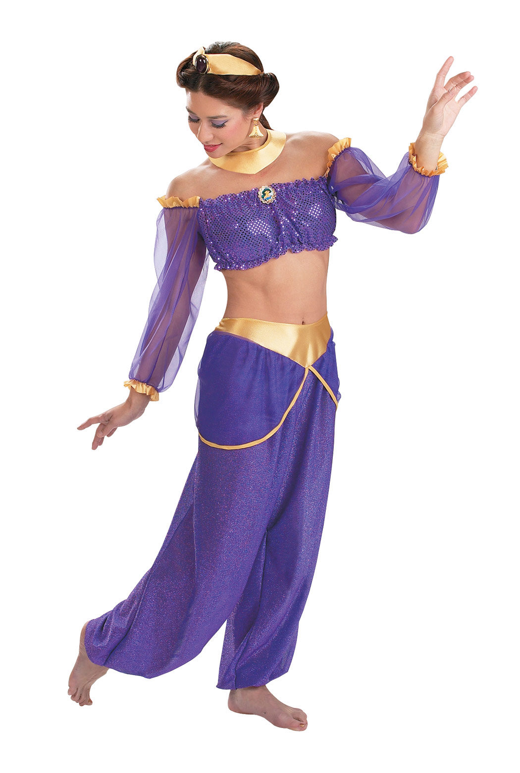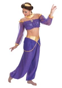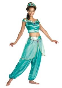 Dark-haired dark-haired girls will look great Mulan's Beauty Costume. Fit and beautiful jasmine outfit in oriental style. Blue harem pants and top of the same shade will look great with shoes and accessories of golden color, as well as decorations in the form of large precious stones.