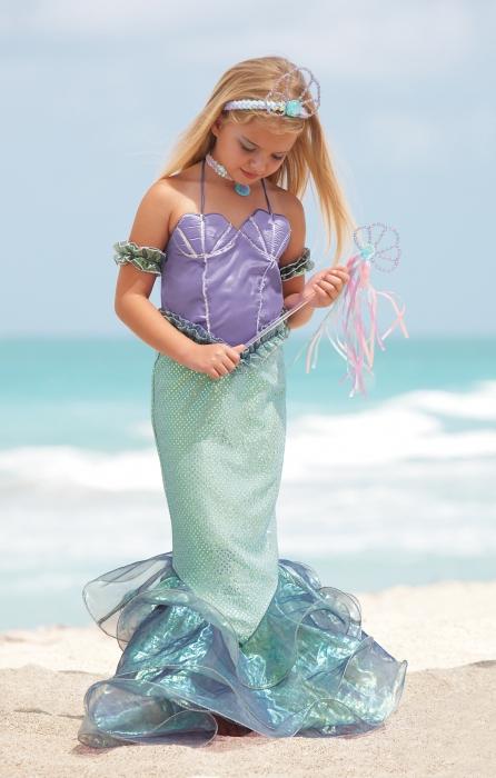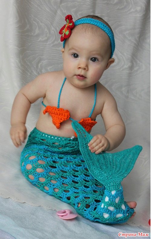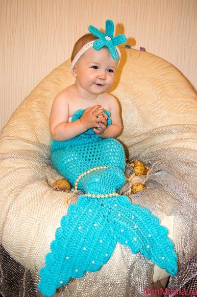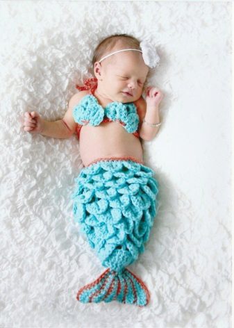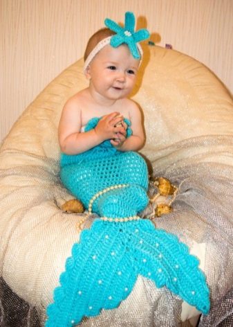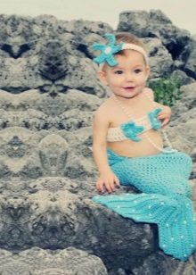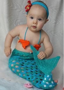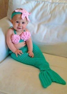 Girls who are not yet able to move independently can be dressed up in little mermaid costume Thus, the "fish" tail does not impede the movement of the baby. A wig with red hair and a purple top in the form of shells will help to create an image in the style of a Disney heroine.